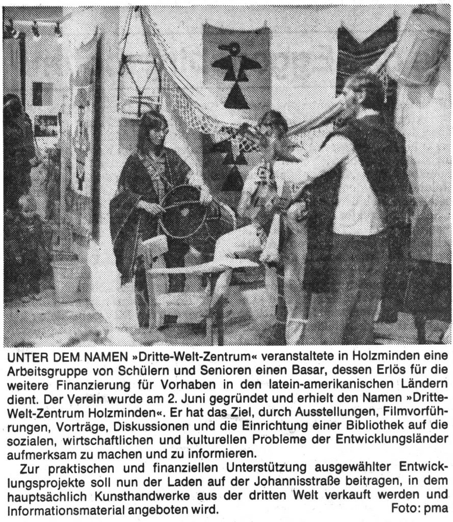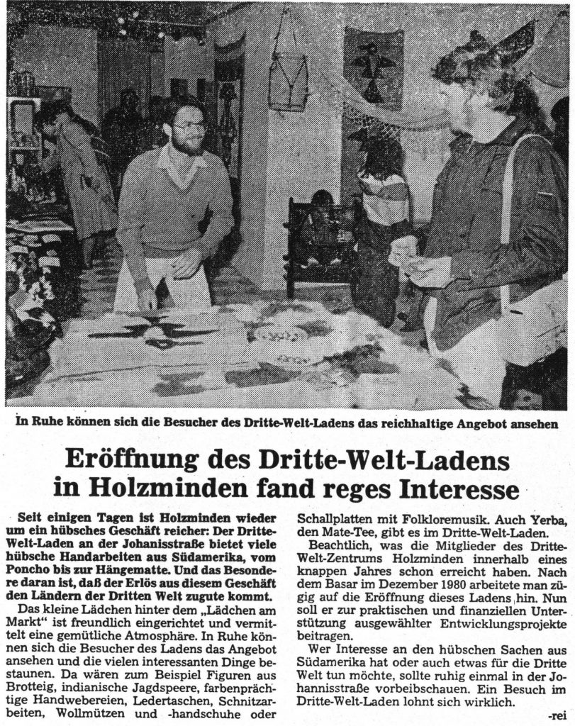 Ladeneröffnung Eröffnung des Weltladens am 22. August 1981 Familie Mohrmann spielte zur Ladeneröffnung _______________________________________________________________________________________________ Aus dem Täglichen Anzeiger Holzminden am 27.08.1981 Aus dem Westfalenblatt (Höxter) am 27.08.1981